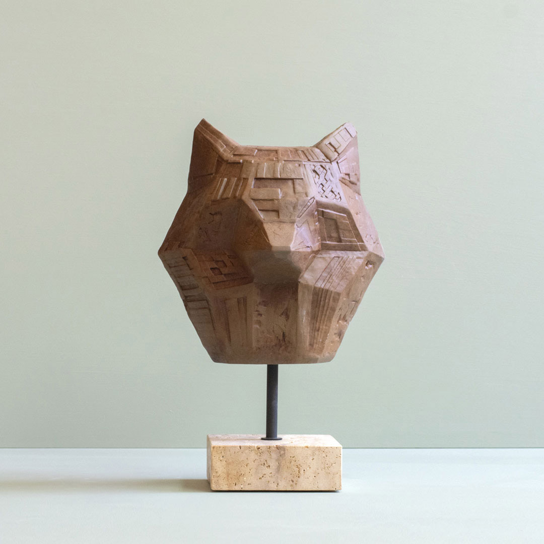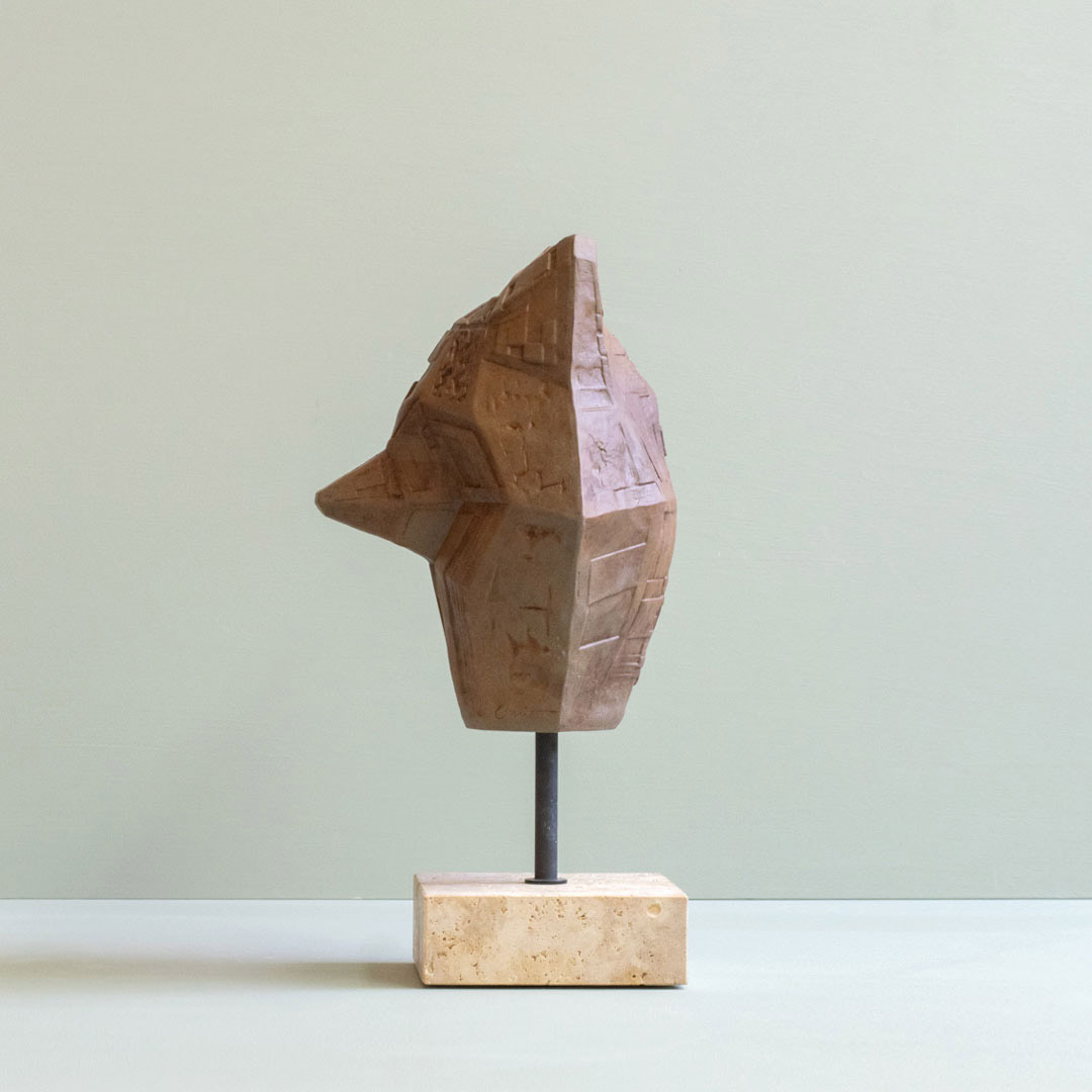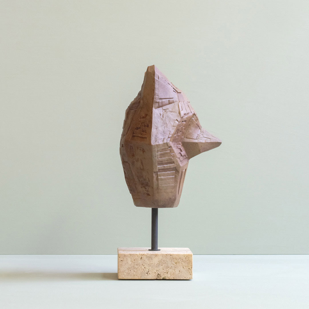 Handcrafted in porcelain with pigments blended into the clay body to create a warm brown tone. The unglazed piece is enhanced with a subtle patina obtained by staining it with oxides, highlighting the natural texture of the material, and mounted on a travertino slab.