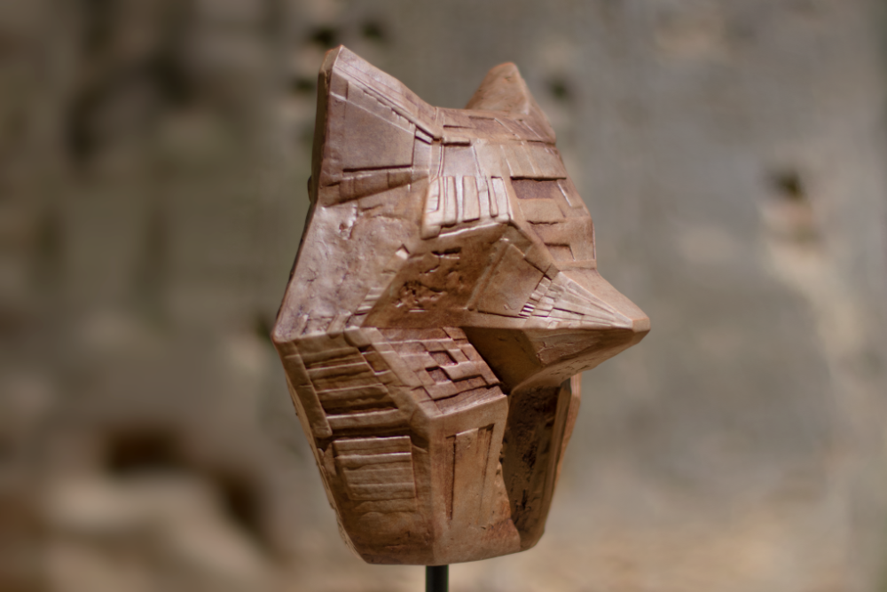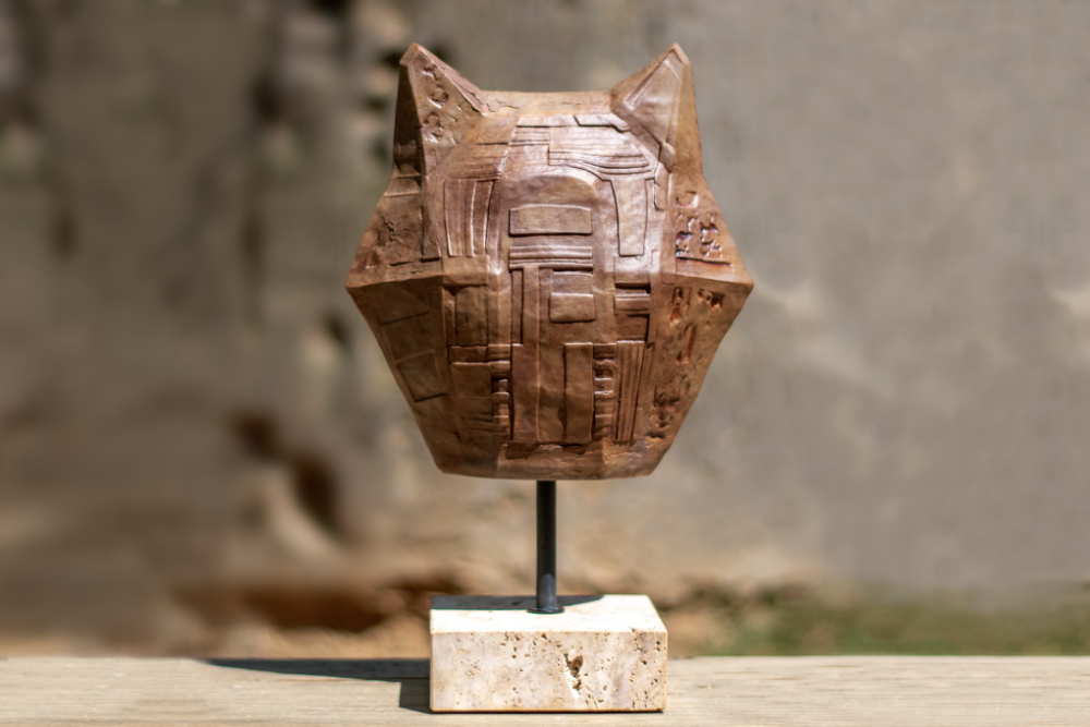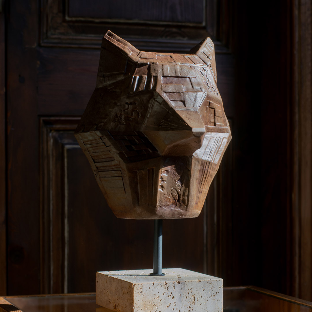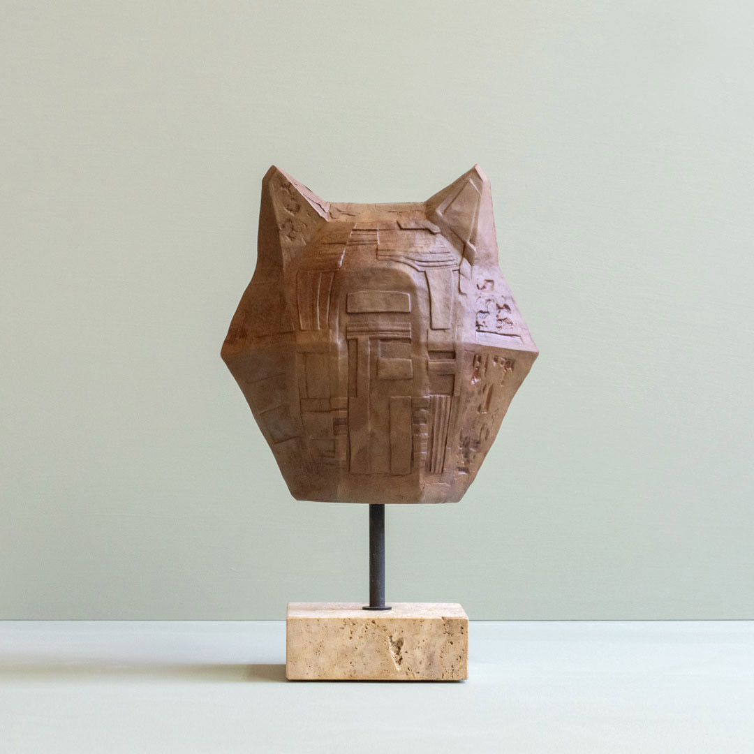 Handcrafted in porcelain with pigments blended into the clay body to create a warm brown tone. The unglazed piece is enhanced with a subtle patina obtained by staining it with oxides, highlighting the natural texture of the material, and mounted on a travertino slab.