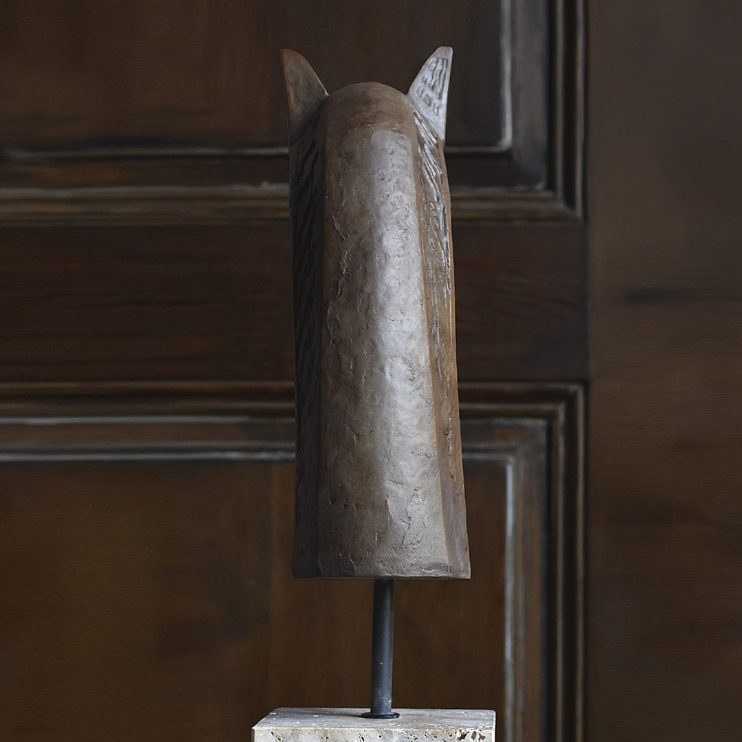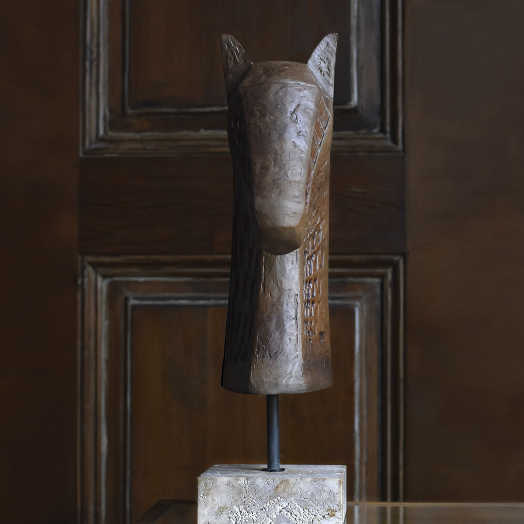 Handcrafted in porcelain with pigments blended into the clay body to create a warm brown tone. The unglazed piece is enhanced with a subtle patina obtained by staining it with oxides, highlighting the natural texture of the material, and mounted on a travertino slab.